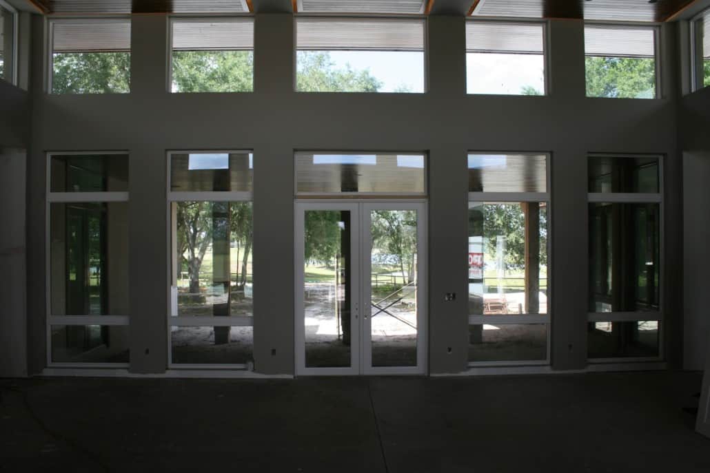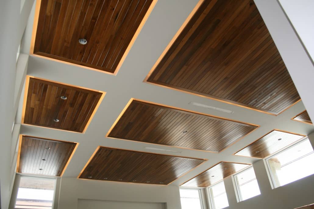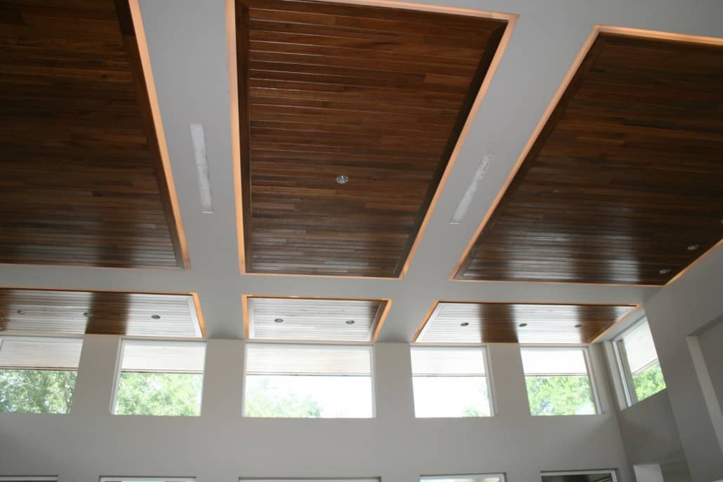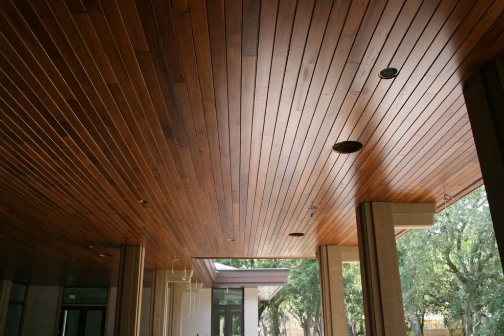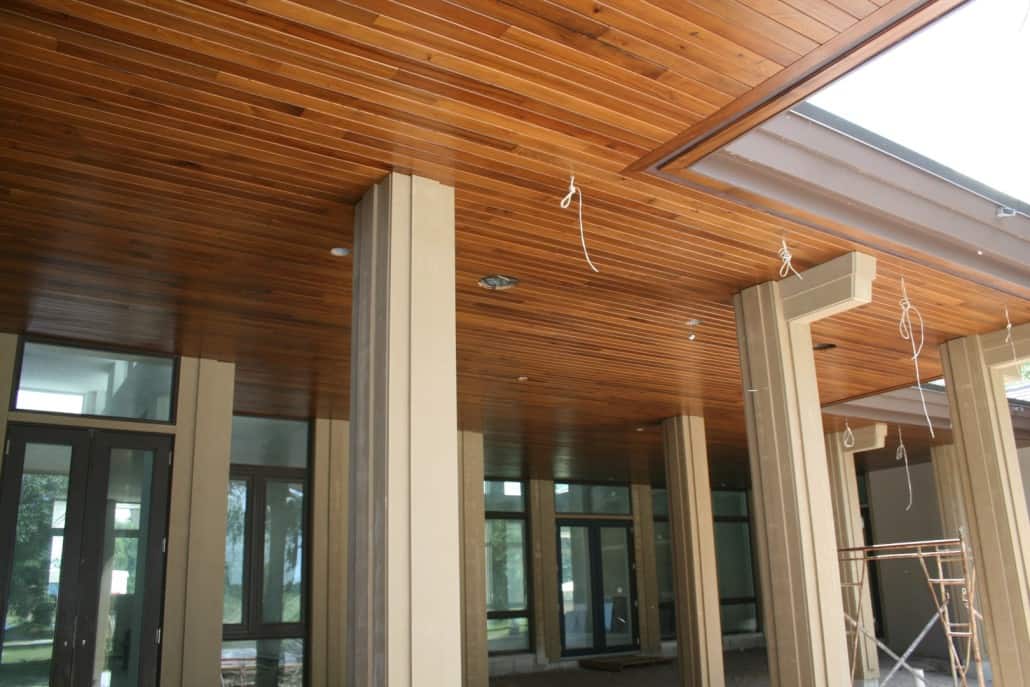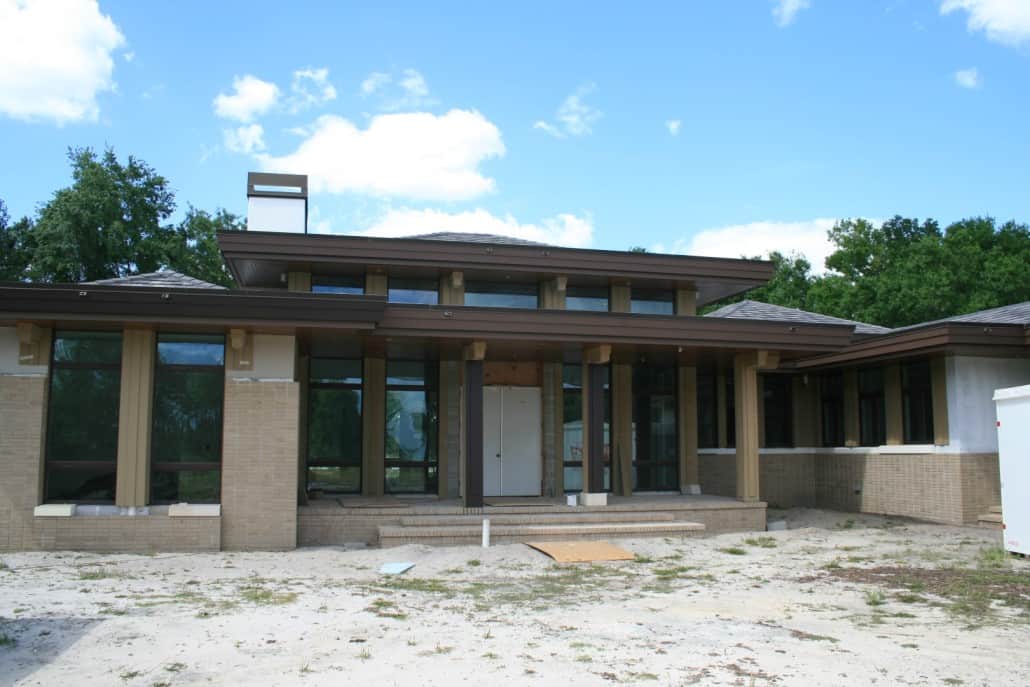 Marc Rutenberg Homes has been the trailblazer in building Zero-Energy, LEED certified homes. Their next home – located in the prestigious Champion’s Club in Trinity, Florida –is slated for completion soon. “The Breakwater” is a Frank Lloyd Wright inspired prairie style creation that incorporates Goodwin’s River-Recovered® Heart Cypress on both the interior and exterior ceilings. This attractive reclaimed wood has been stained darker than its natural color and is being installed using clean, straight lines. A distinguishing prairie style feature is the clean lines extending out into infinite space coupled with a low flat series of roofs. Here are some photos of the home under construction: