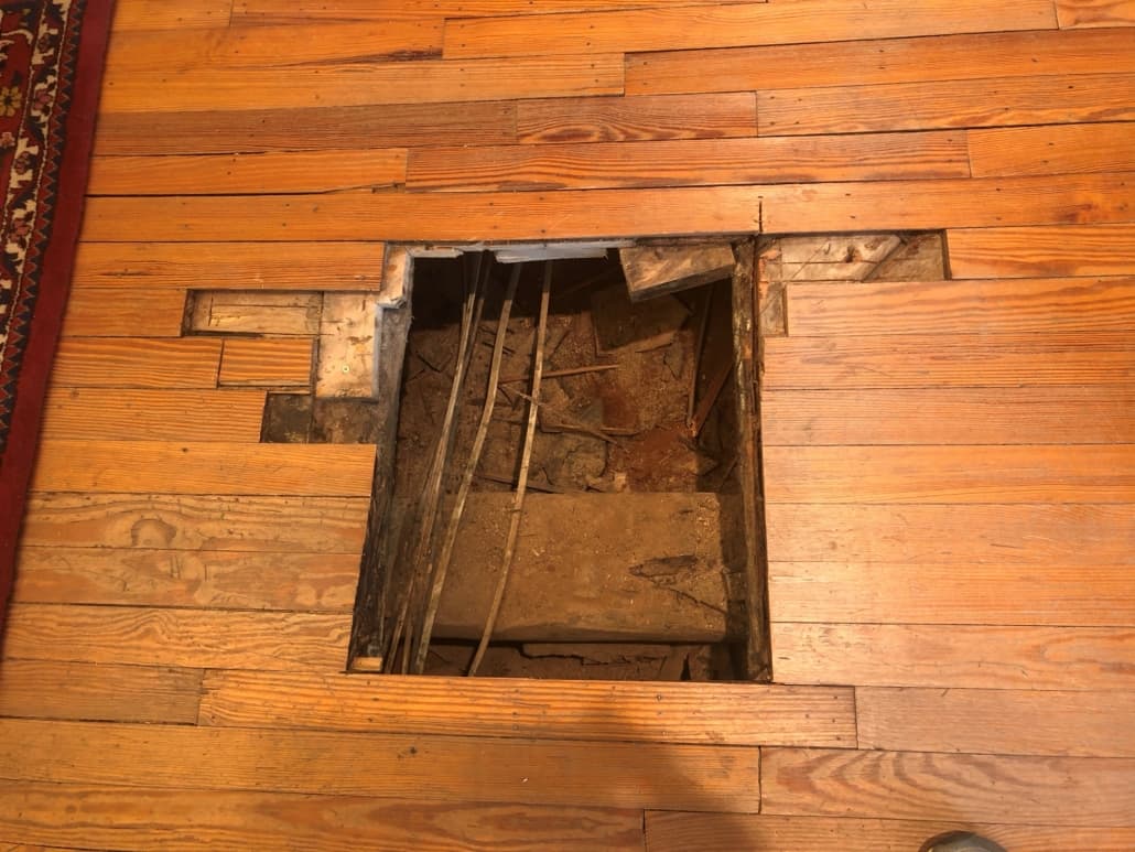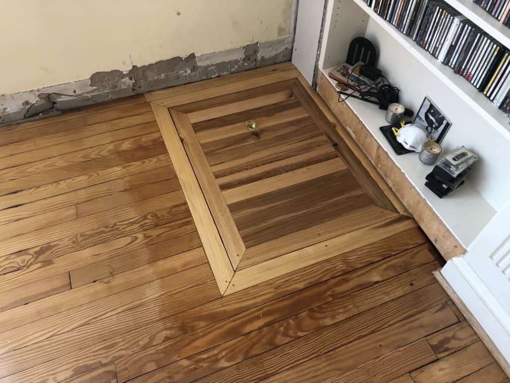 Our good friend Bill Conway in Potomac, Maryland needed to repair some parts of his pine flooring due to termite damage. We milled 2-1/4″ River-Recovered® vertical heart pine to replace the bad sections of floor. Conway also built a trapdoor using River-Recovered heart pine vertical to access the space beneath his house.