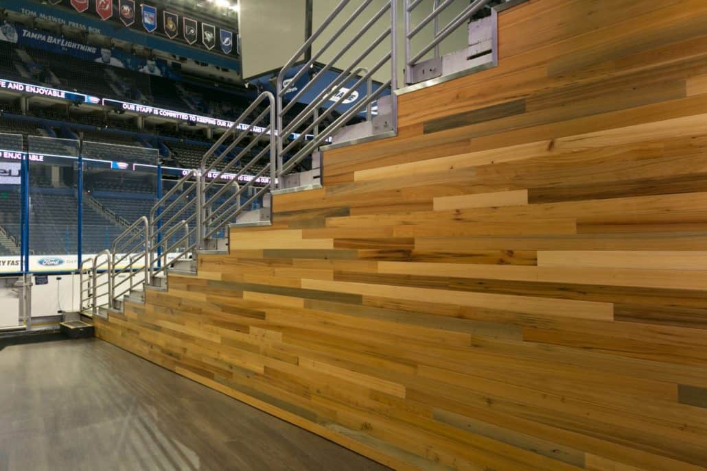Micro-beveling is required for factory finishes. Goodwin’s micro-bevel starts at twenty thousandths of an inch and is less after sanding and finishing. The tongue and groove help maintain alignment of the board ends. This stabilizing effect combined with the better strength properties of the end grain of the boards minimizes the need to bevel the ends.