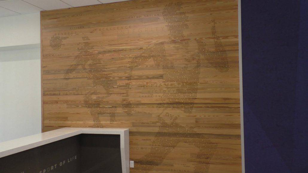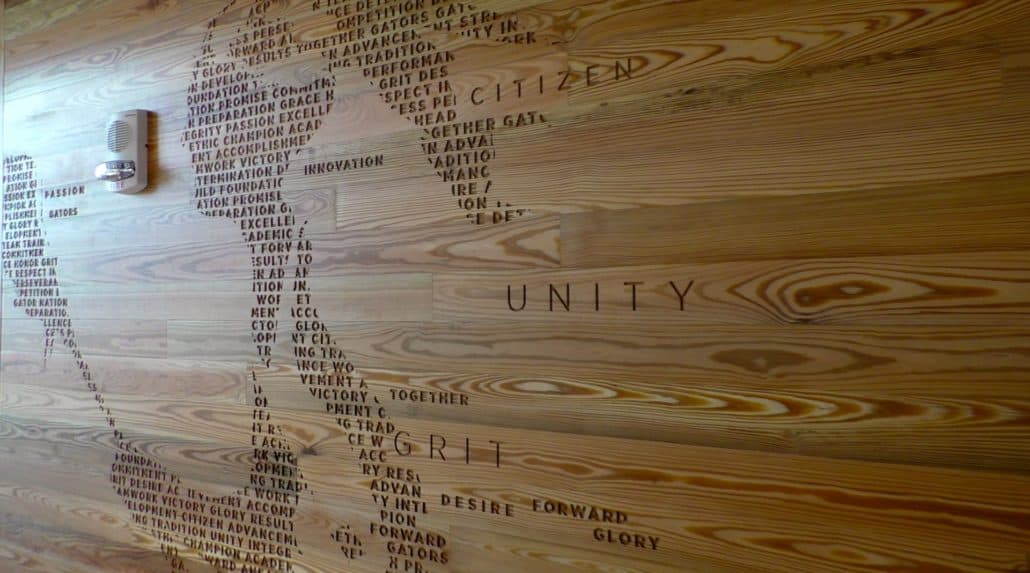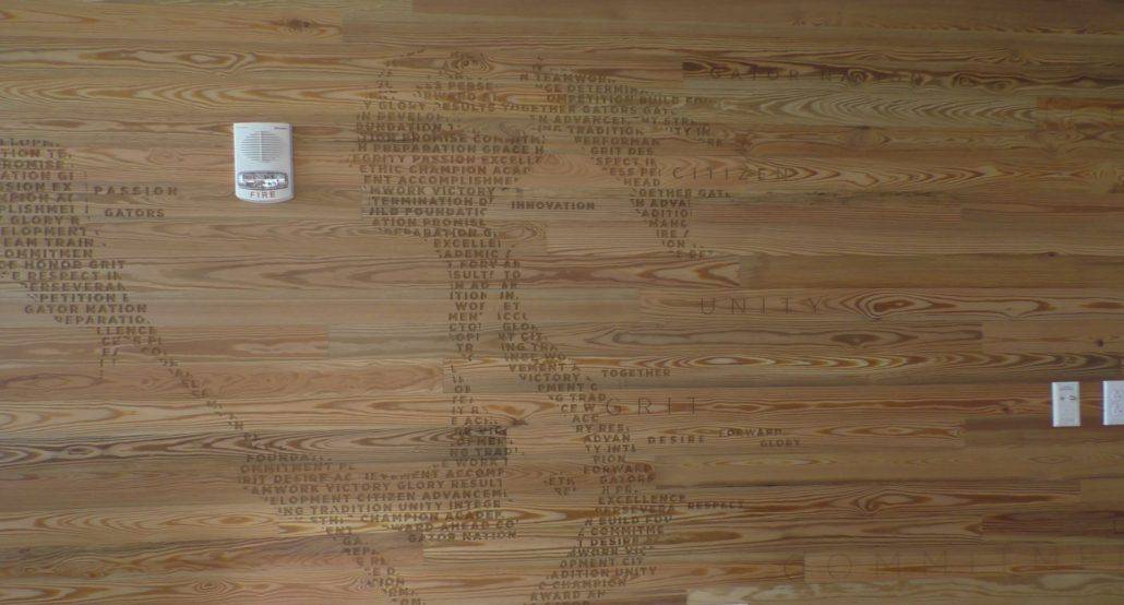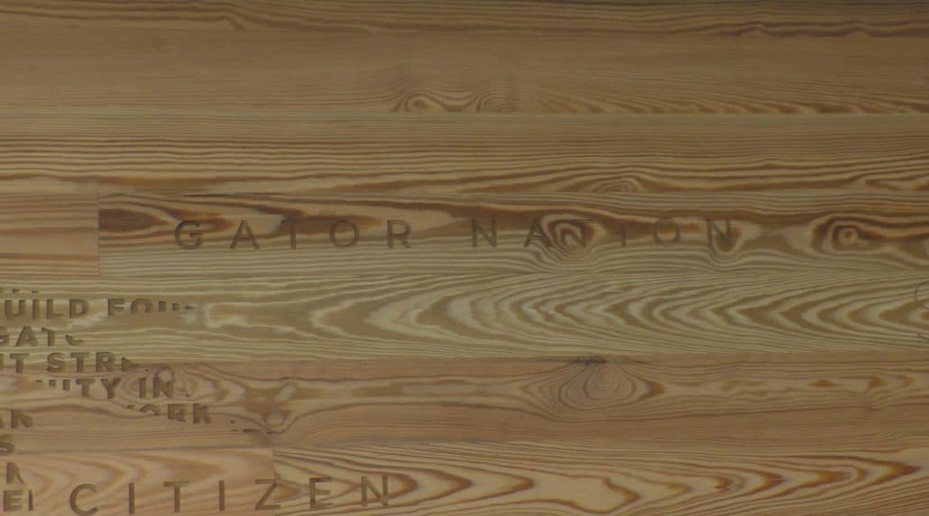 What made the use of antique heart pine so relevant in this project is that the ground UF was built upon was once a vast longleaf pine forest. Ironically, longleaf is pinus palustris or “pine of the swamp,” which fits well with UF’s swamp theme and mascot. From the large western window of the Hawkins Center one gazes upon UF’s storied Ben Hill Griffin stadium, appropriately nicknamed “The Swamp.” Using locally sourced antique heart pine in the Hawkins Center is a nod to the legacy and shared history between UF and the ancient longleaf forest.