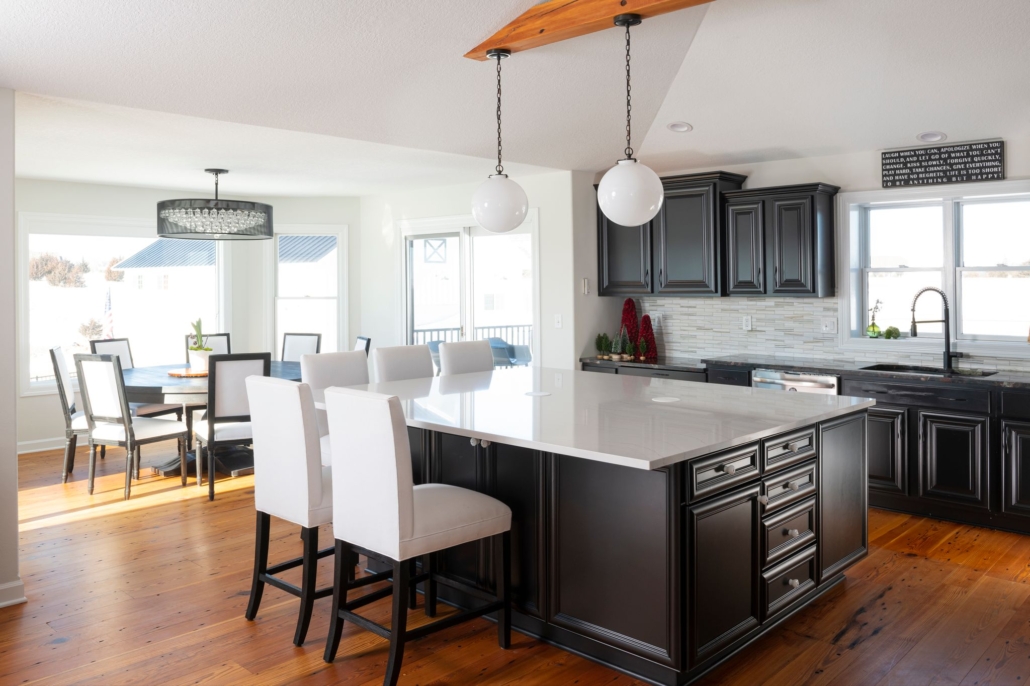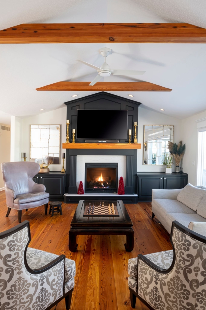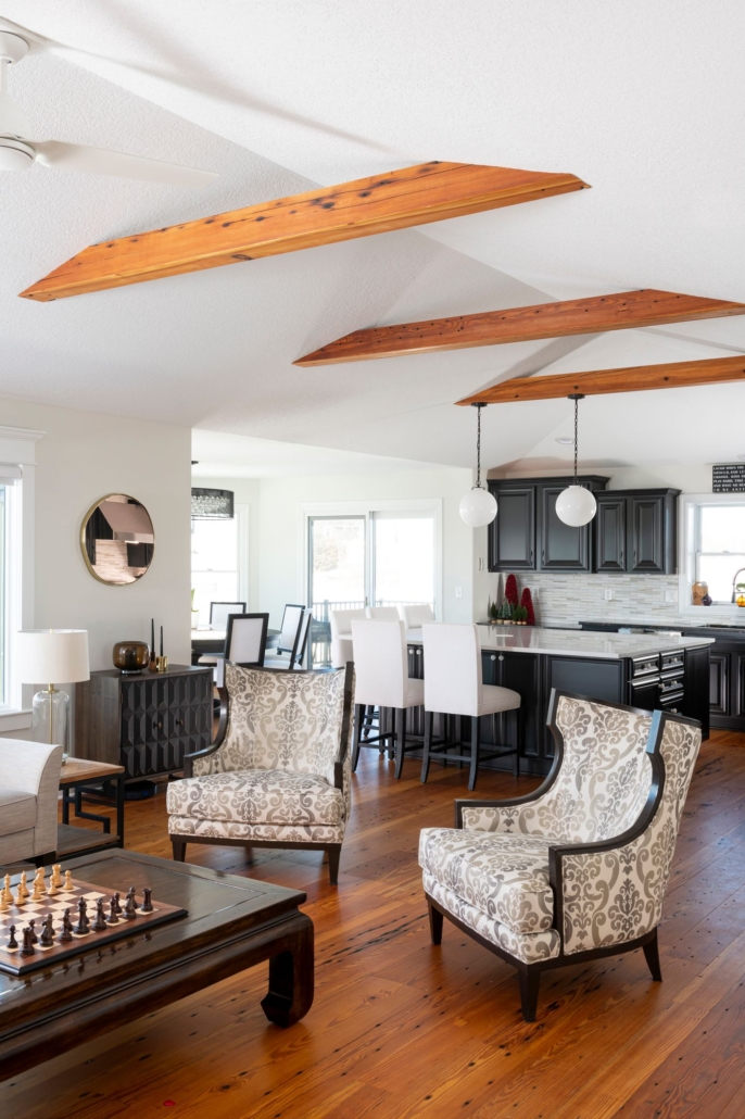 When rustic meets modern farmhouse the yielded results are superb. The floor and beams are Goodwin’s LEGACY (building reclaimed) CHARACTER & NAILY grades in a 4/6/8 mix (3-1/4”, 5-1-/4”, 7”). Attributes include nail holes and nail staining, more frequent and larger knots, and some face checks that help tell the story of the industrial era wood. This Ames, Iowa project was completed by Barnum Floors of Clive, Iowa and general contractor Chaden Halfhill of Silent Rivers Design+Build . Photos supplied by Silent Rivers Design+Build. Photography by Paul Gates Photography Inc.