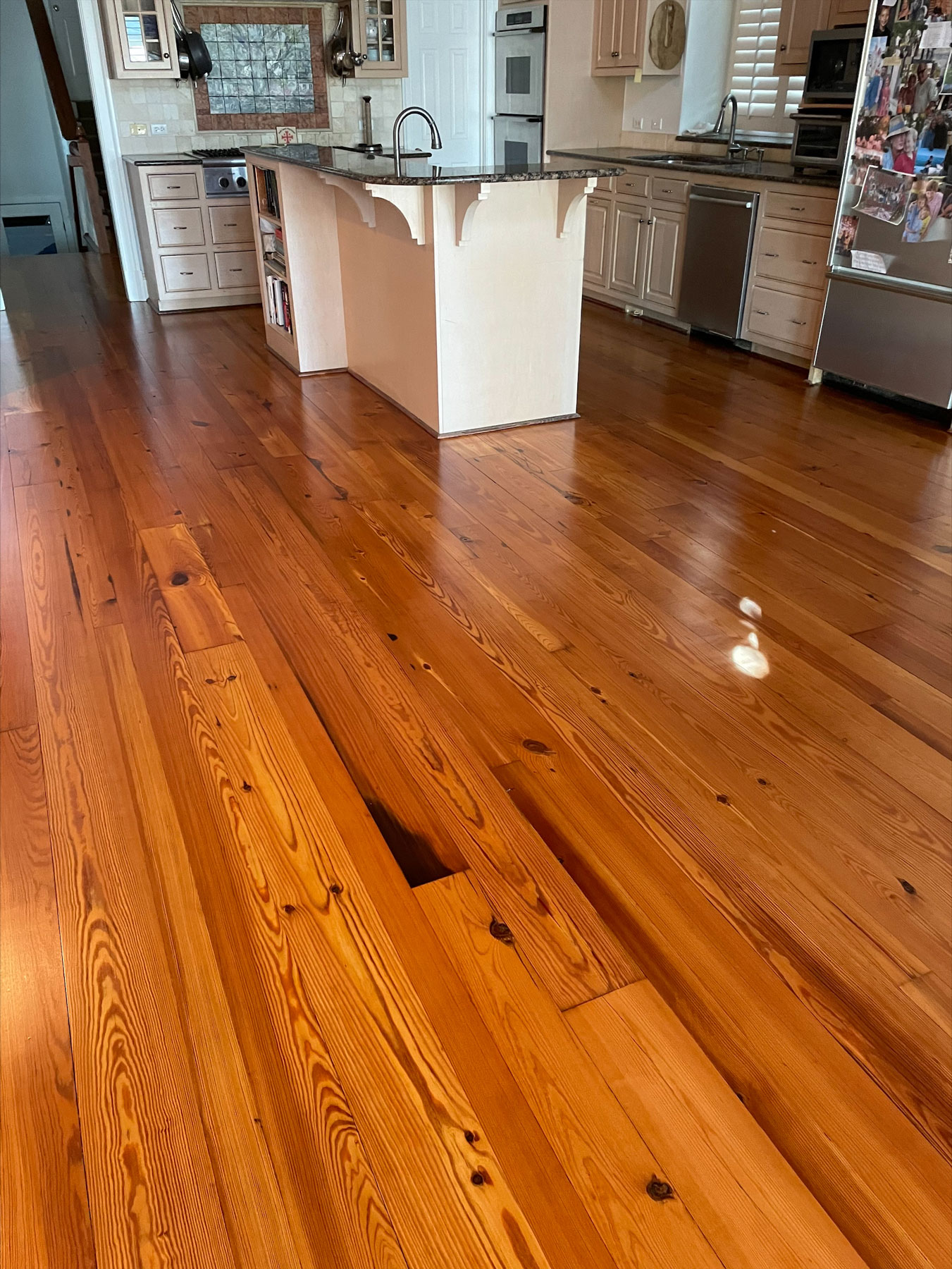 • Antique River-Recovered® Select Heart Pine features a cathedral arching grain with a border of vertical pinstripe grain