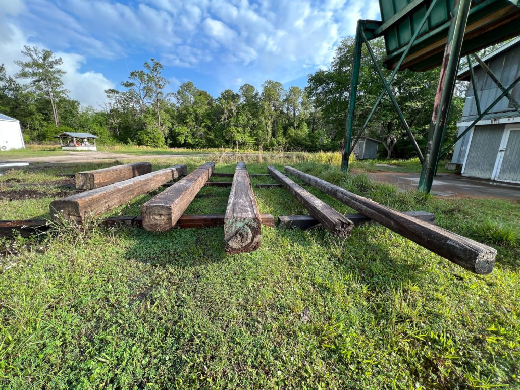 Recently, we pulled River Recovered® longleaf pine logs out of our millpond to mill for several upcoming large projects. Among the material pulled were these six hand-hewn beams. Very rarely do our river logging partners come across beams like these on their dive excursions. Some are milled pieces. Others are obviously hand-hewn beams. So, what gives? How do squared timbers end up underwater? The answer is rather simple.