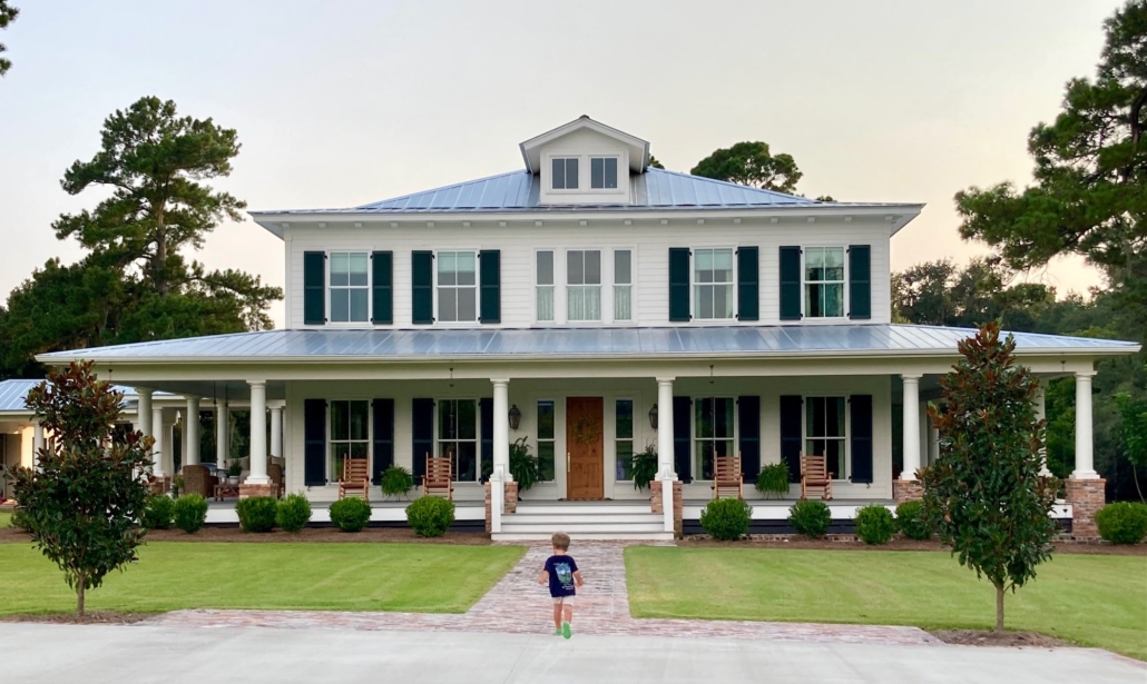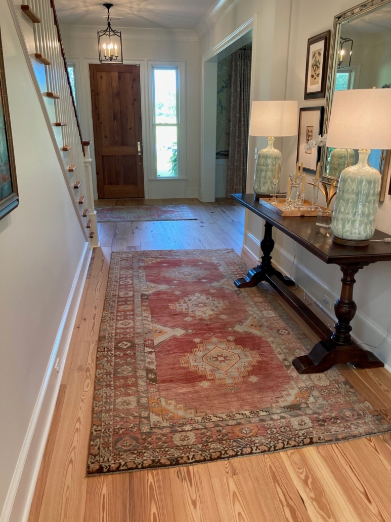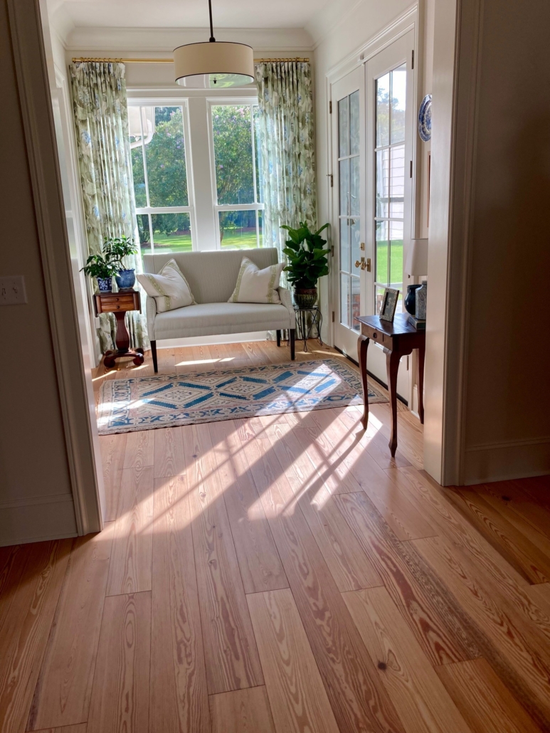 Heart pine is equally prized for its beauty. This modern built home nods to the architecture of an earlier era. Its wide and inviting veranda welcomes you on approach. Beyond the custom heart pine front door, we are treated to a step back in time through the many delightful appointments. In a wonderful twist that marries the traditional with the new, the elegant heart pine floor is a Goodwin Co. River-Recovered® CLASSIC 7”, a modern precision engineered product. The luminous and vibrant color of the floor along with the cathedral arching grain gives a warmth to each space that says “home”, traditional home.