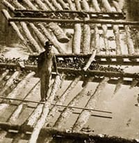 By 1850 the South had constructed only 2000 miles of railroad, so the best way to transport longleaf logs to downstream sawmills was to use the rivers. The common method for timbering was to cut trees with axes and drag logs with oxen or mule teams to the riverbanks. As more and more people moved to the South, lumber companies began to take their crews further inland in search of more heart pine. Loggers dug manmade canals to carry the inland logs to the river.