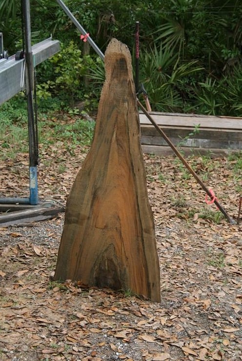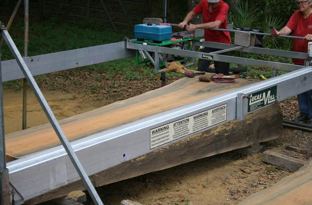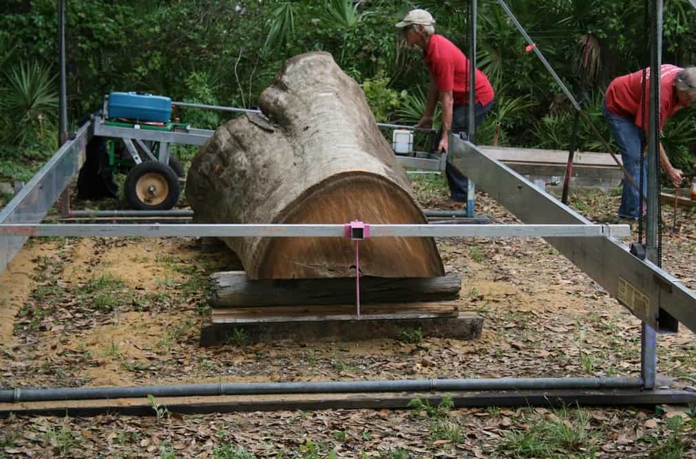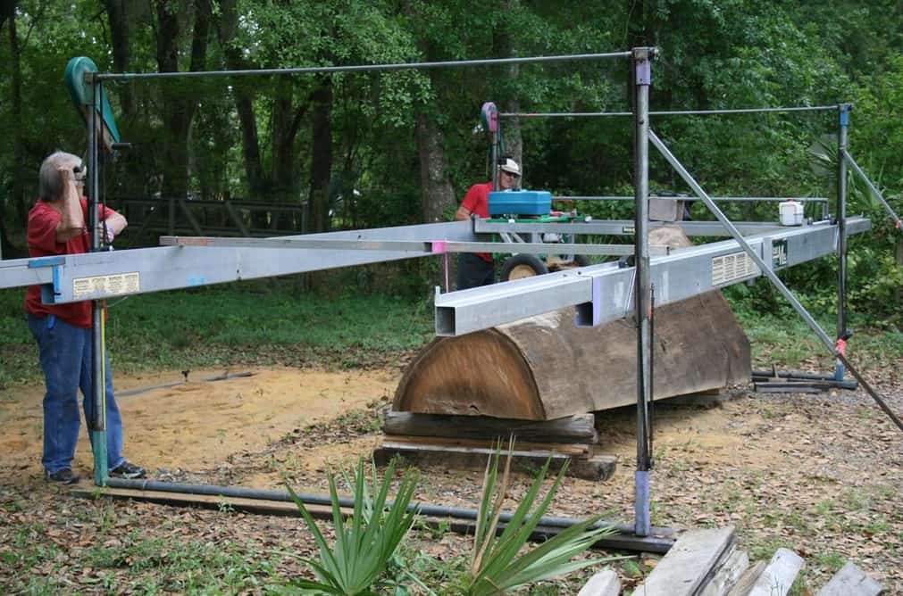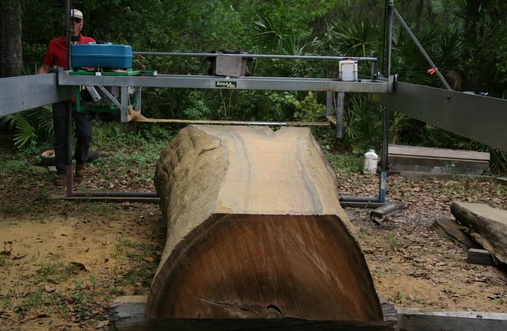 We were excited to have an opportunity to work with Florida Crotchwood Mobile Sawmill. Paula and Randy came out to Goodwin and helped George saw 3″ thick, four-foot wide and 10-foot long River-Recovered Heart Cypress slabs off the end of our “Gentle Giant”.