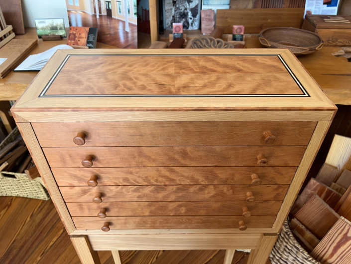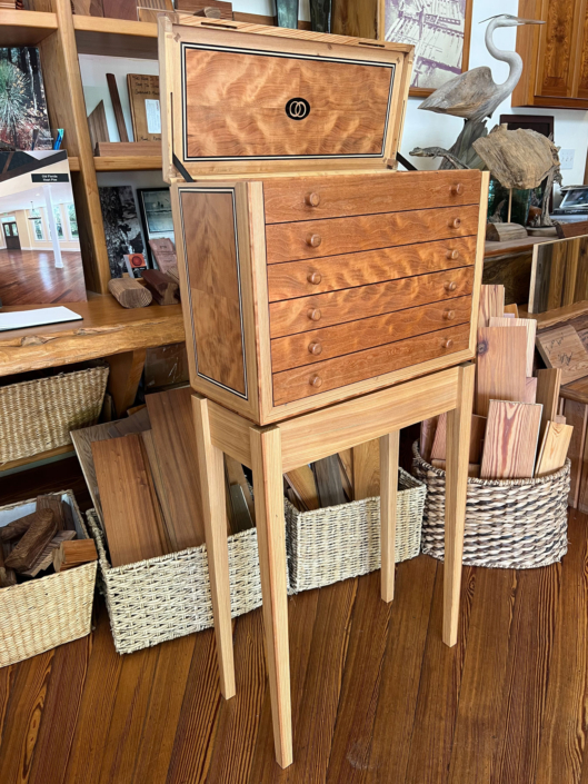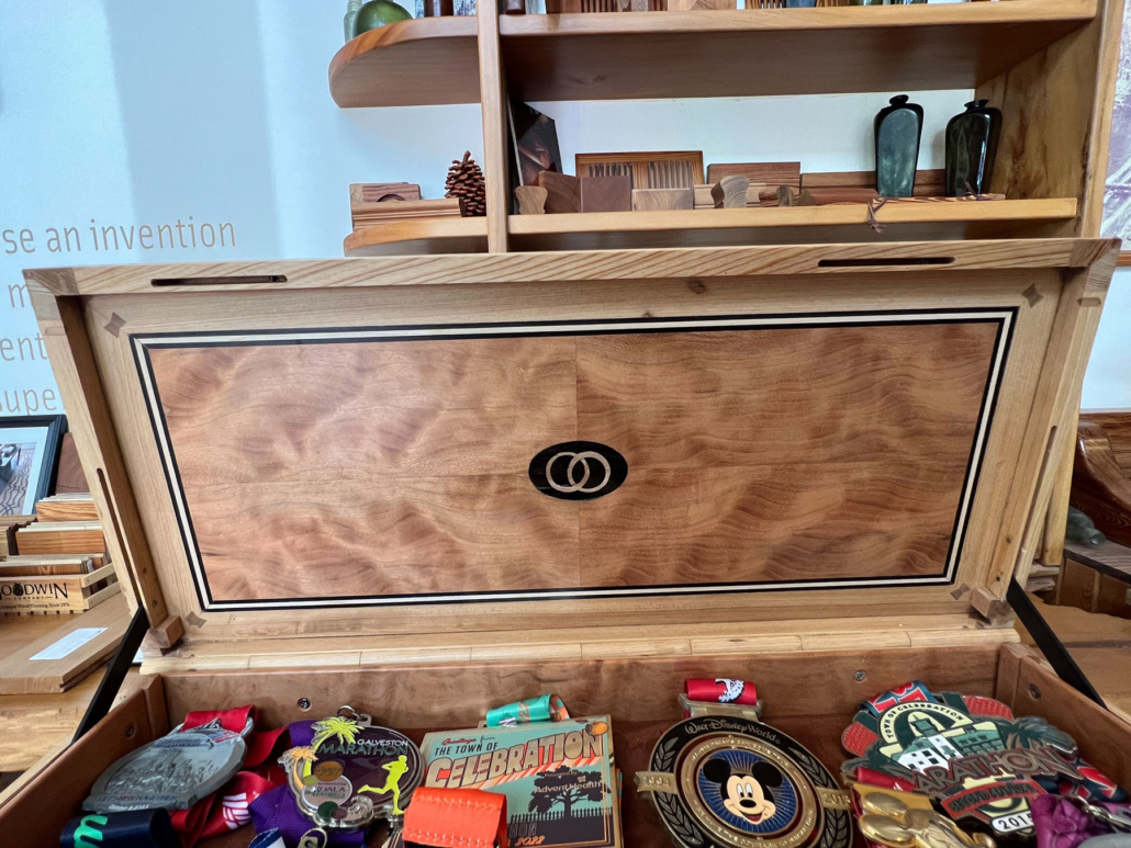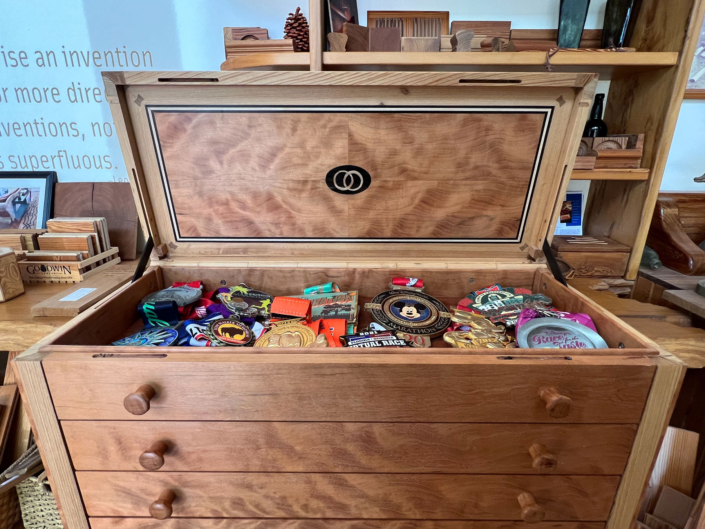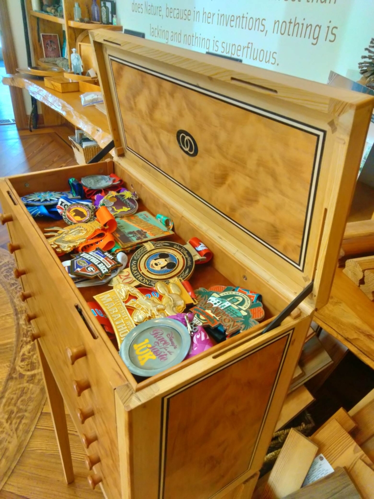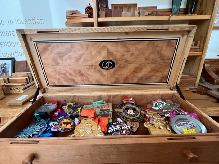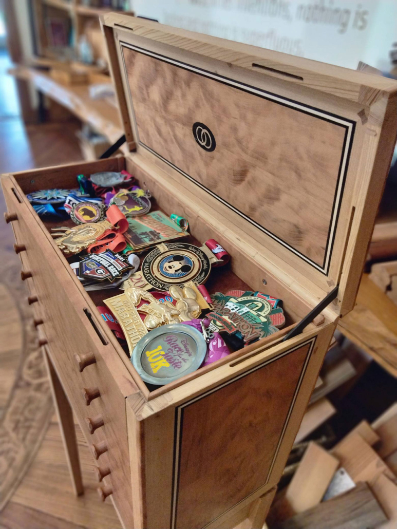 Megan has run at least 15 marathons. Double that or more when it comes to half marathons. And then there are the countless 5 and 10ks. So for their 25th wedding anniversary in April Jeffrey commissioned, Jerry Yermovsky, to design and make her a custom collector’s cabinet to display her many medals. This handcrafted piece is the stunning result. River-Recovered® Heart Cypress and Wild Black Cherry never looked so good together before!