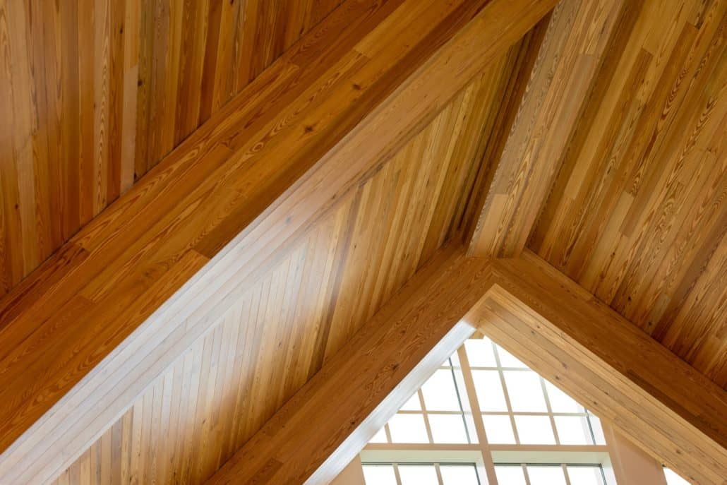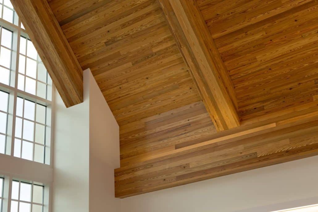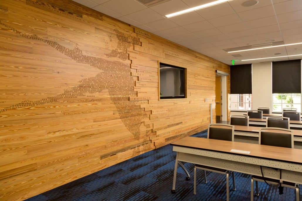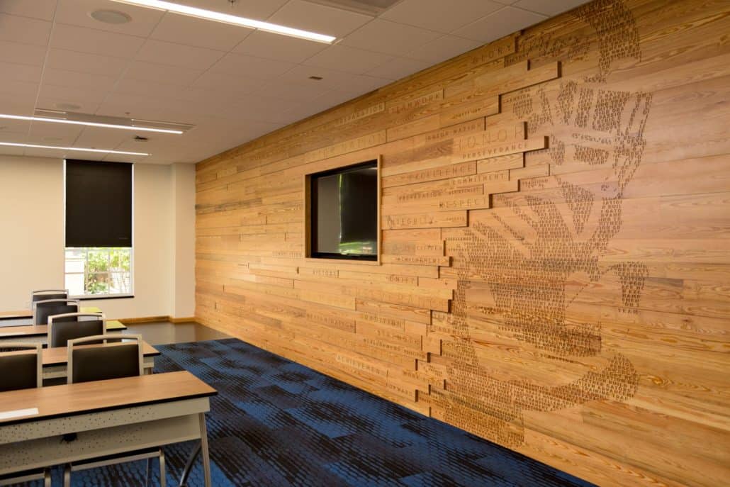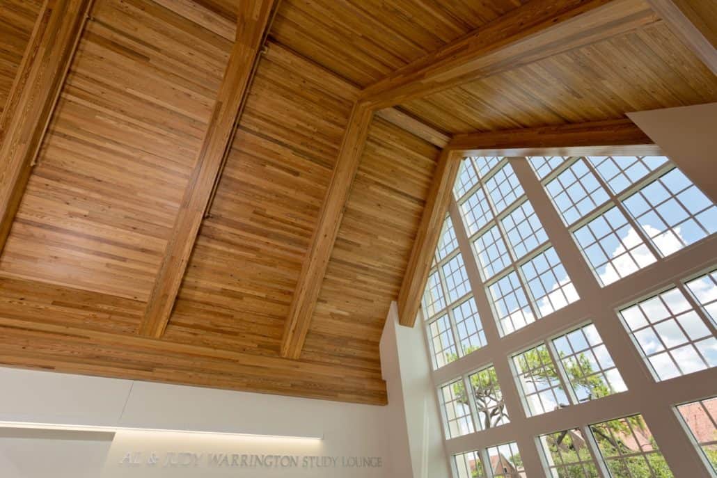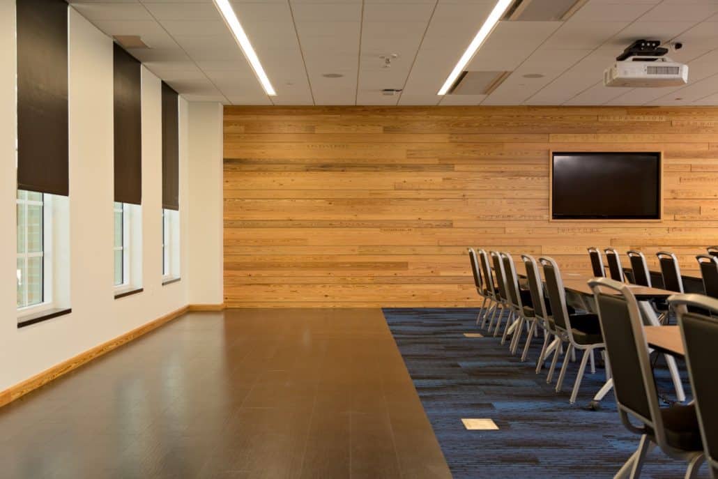“The new Hawkins Center incorporates locally sourced, antique wood into a contemporary design,” explains Howard. “We wanted to build the highest caliber, most unique and modern collegiate academic center to provide all the necessary resources for our students, so Goodwin’s River-Recovered® Heart Pine just made sense. Goodwin is the pioneer in the industry. The sustainability of the wood, coupled with its unmatched quality and remarkable beauty, contribute significantly to the overall aesthetics and appeal of the building.”