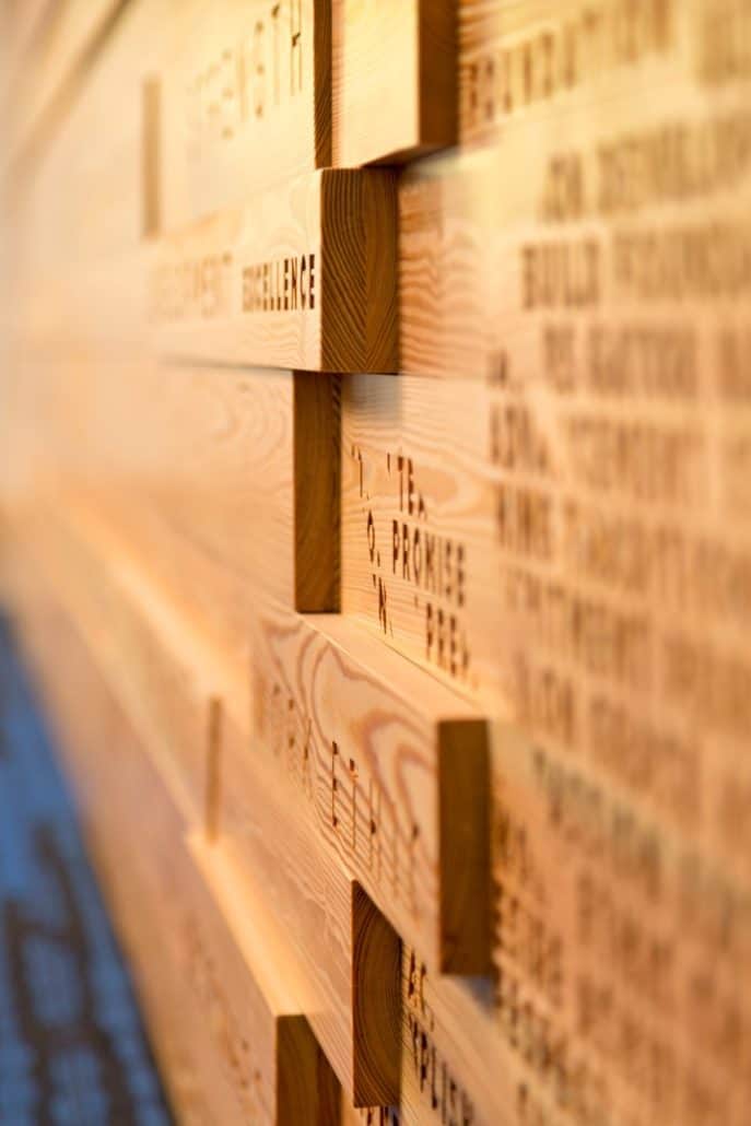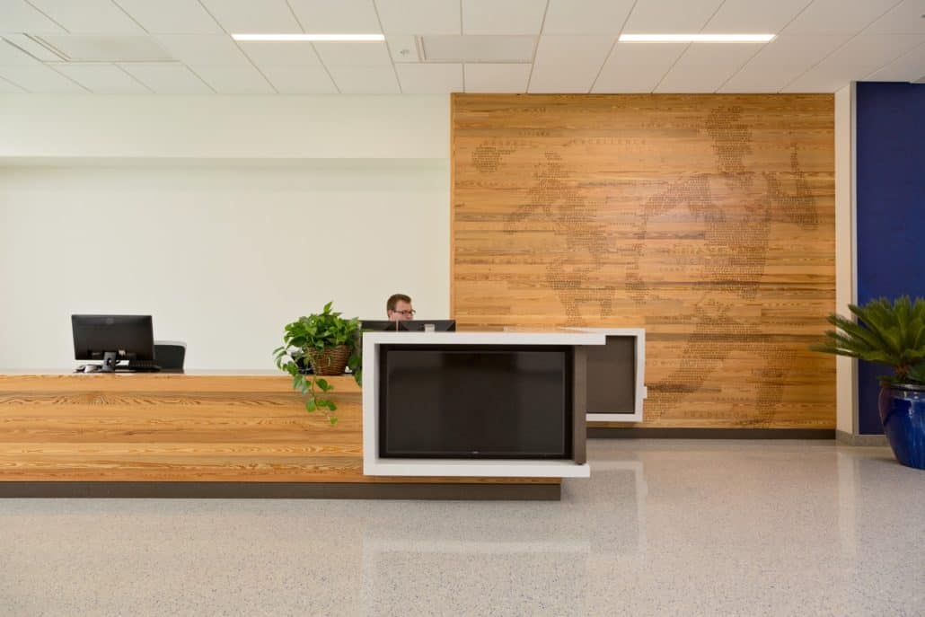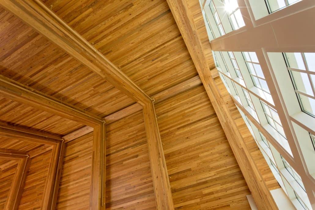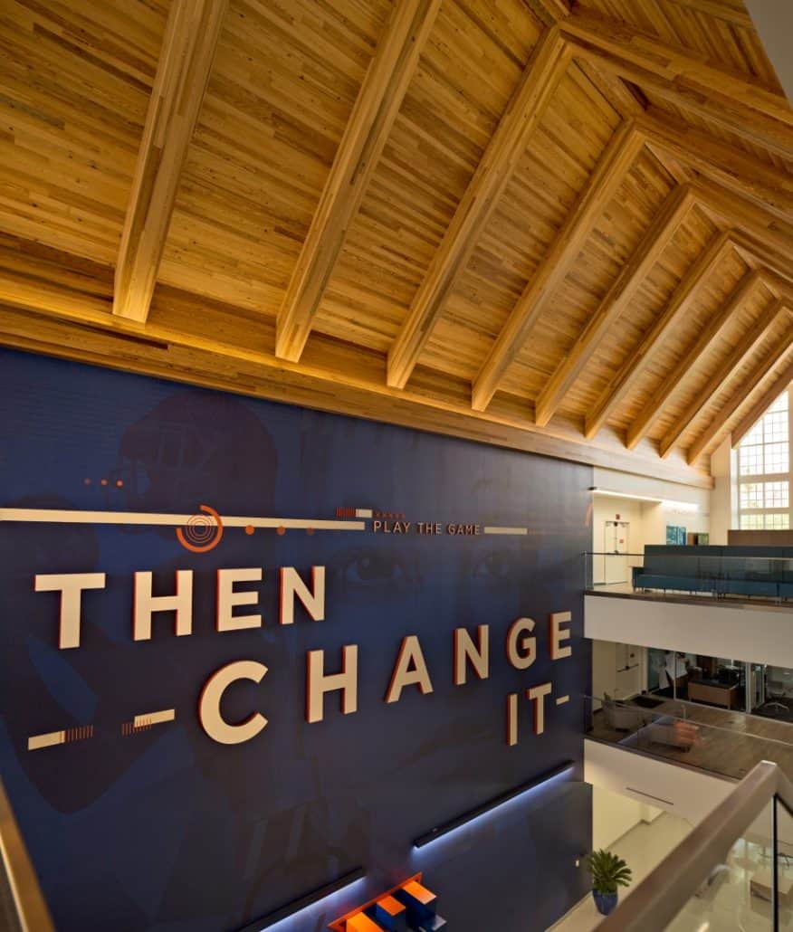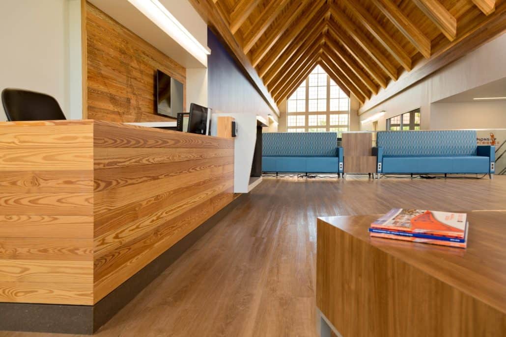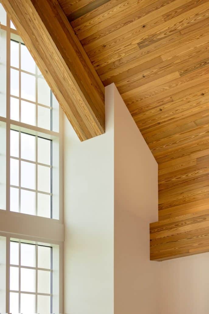 “The new Hawkins Center incorporates locally sourced, antique wood into a contemporary design,” explains Howard. “We wanted to build the highest caliber, most unique and modern collegiate academic center to provide all the necessary resources for our students, so Goodwin’s River-Recovered® Heart Pine just made sense. Goodwin is the pioneer in the industry. The sustainability of the wood, coupled with its unmatched quality and remarkable beauty, contribute significantly to the overall aesthetics and appeal of the building.”