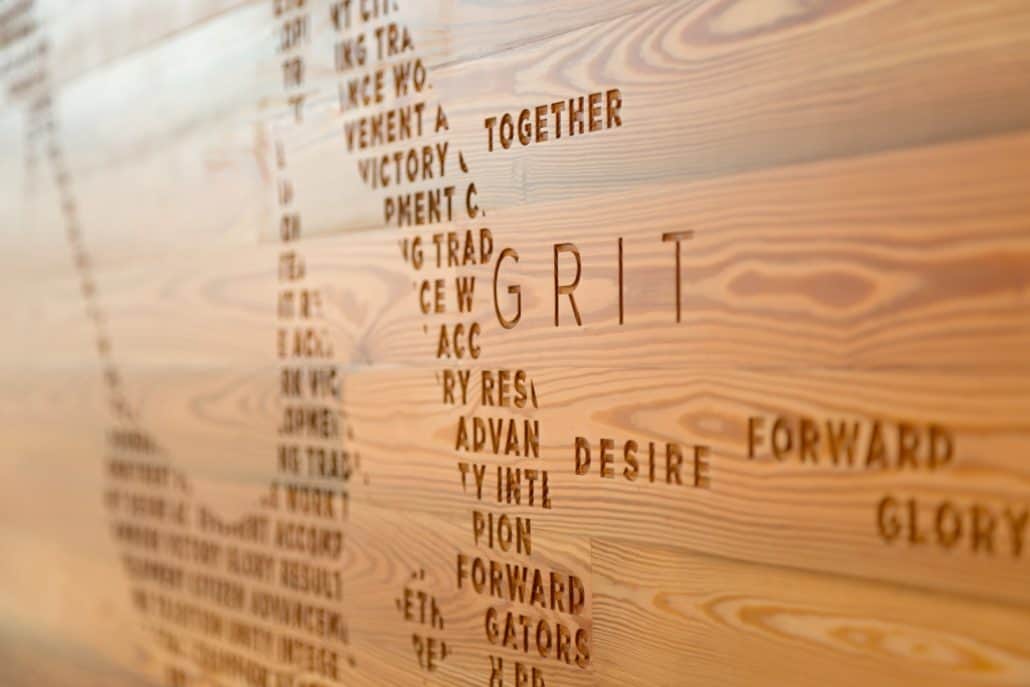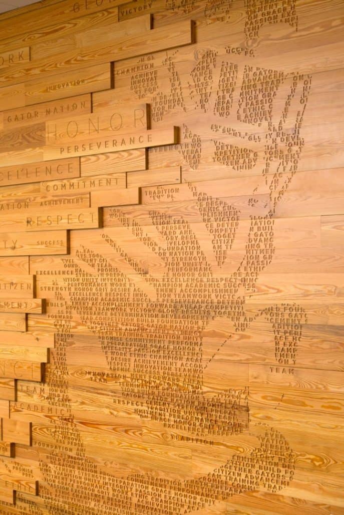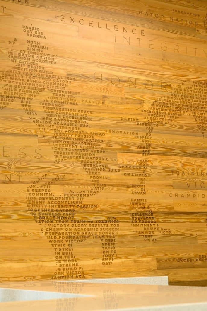 According to Chip Howard, Executive Associate Athletic Director for Internal Affairs, UF sits upon what once was a vast longleaf pine forest. Longleaf is pinus palustris or “pine of the swamp.” UF Grounds Services uses many native species when planting and several of the new buildings on campus have added young longleaf pines into their landscapes. The incorporation of locally sourced antique heart pine in the Hawkins Center is a nod to the legacy and shared history between UF and that ancient longleaf forest.