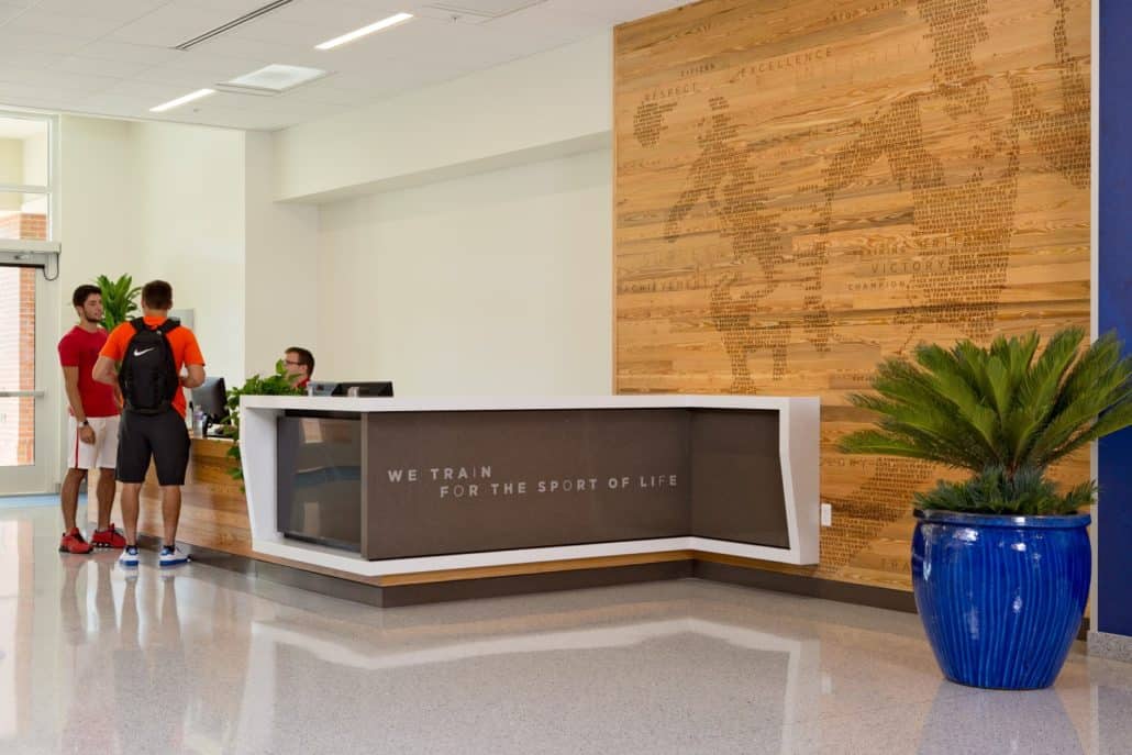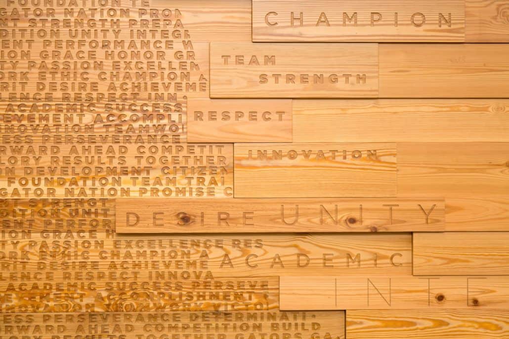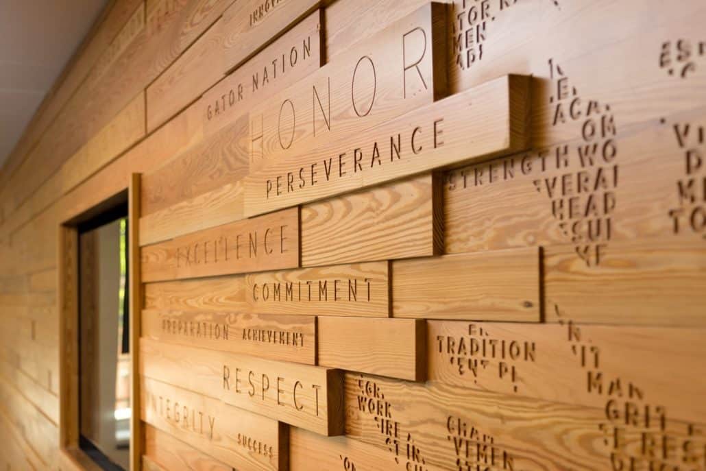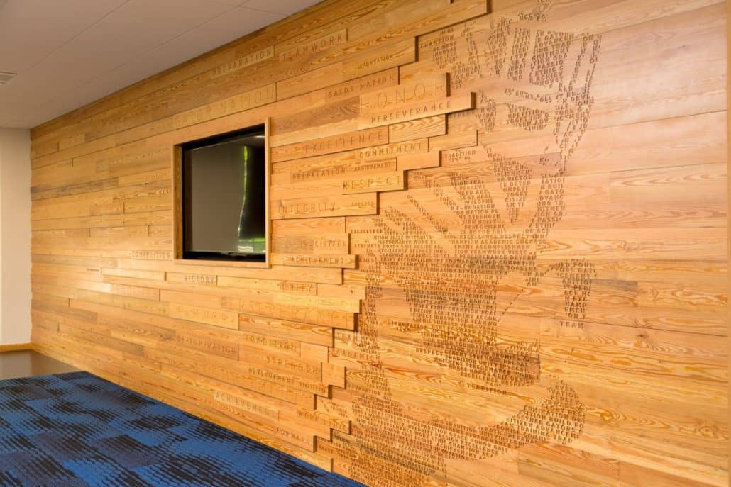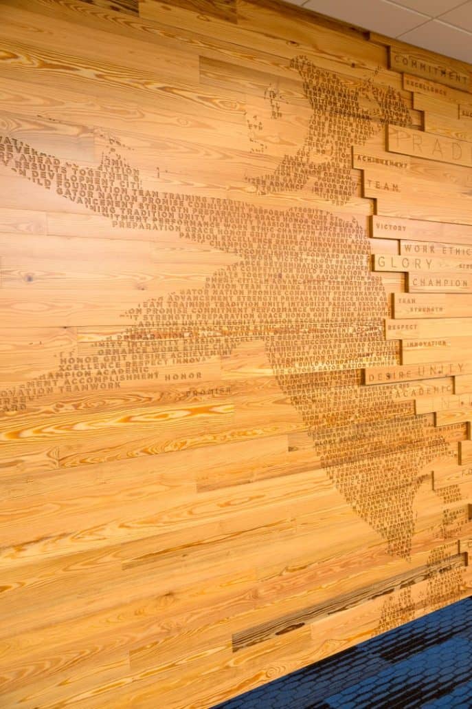 (Gainesville, FL) – Sustainable, River-Recovered® Heart Pine is the focal point of the University of Florida’s (UF) new, world-class, Otis Hawkins Center for Academic and Personal Excellence (Hawkins Center); designed to support and enhance the academic experiences of the university’s athletes. The wood – which encompasses 10,000 square feet of ceiling and wall paneling – was provided by Goodwin Company, pioneers of the River-Recovered® process. Goodwin recovers antique logs from river bottoms – where they have been perfectly preserved for hundreds of years – and mills them into arguably the most beautiful and sustainable wood flooring and paneling in the world.